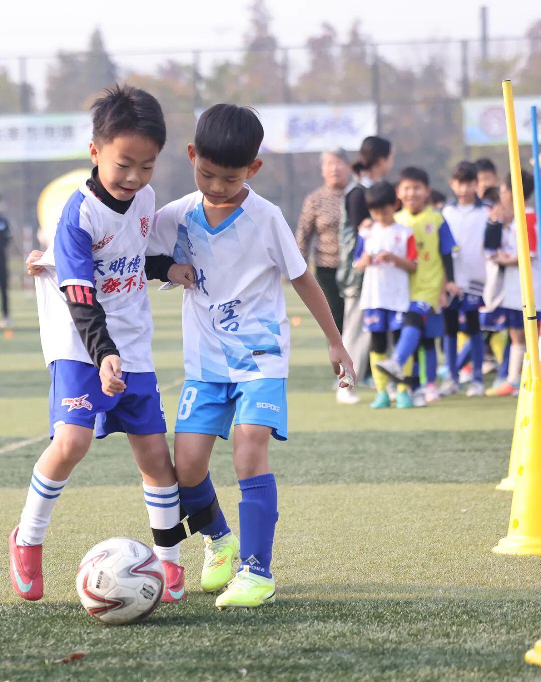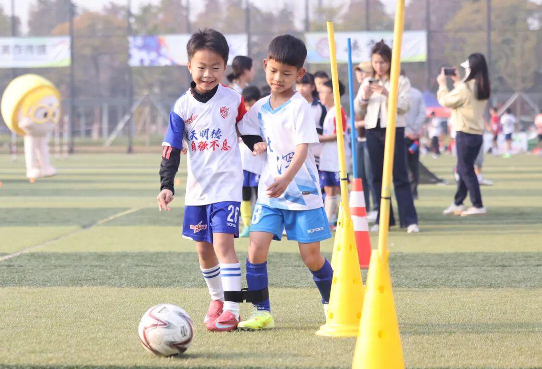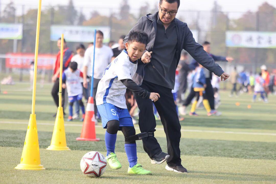 “趣味绕杆挑战”中,孩子们变身灵活“小将”,带着充气足球穿梭于障碍之间;“转圈射12码大挑战”则笑料频出,家长充当临时守门员,与转完圈后略显晕乎的“小射手”斗智斗勇;“2人3足绕杆射门”紧密捆绑着亲子间的默契与步伐;而“我有‘大力神杯’”则需要极致的平衡与协作。
